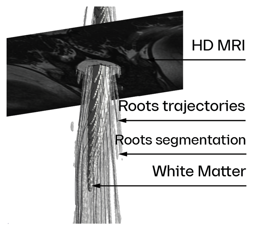 From magnetic resonance imaging (MRI) sequences optimized for spinal rootlet contrast, Sim4Life generated a patient-specific spine model using artificial intelligence (AI)-assisted segmentation and expert quality assurance. Dorsal roots were neuro-functionalized with ~1,000 axonal trajectories (types and diameters sampled from physiological distributions), enabling realistic recruitment predictions [6].